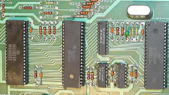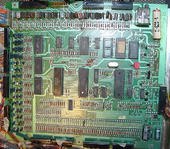 1e. Getting Started: Introduction to Bally 6803. Bally's 6803 system, used from 1985 to 1989, incorporated some unique features and designs that differed from the other pinball manufacturers. Generally speaking, these games were not that good, but there were some "stars" amoung the black (Strange Science probably being the most notable). The "6803 Control Board" (aka "CPU Board", which is what I call it in this document) used a 6803 CPU chip as the brains of these games (and hence the "6803" name). The 6803 was different than the 6802/6808 used by Williams previously, in that the 6803 supports "multiplexing". As Bally used multiplexing, this allowed the CPU chip to support more CPU controlled playfield lamps and flash lamps with less driver board SCRs (transistors). The 6803 chip also has onboard RAM, much like the 6802 chip. Two 6821 PIA (Peripheral Interface Adaptor) chips were used to interface the 6803 CPU chip to the lamps, coils and switches (much like the Bally -35 boardset and Williams' pinball systems). Static RAM is handled by a 6116 RAM chip (instead of the problematic and discontinued 5101). Most noteworthy is the use of a single board for both the CPU board and driver board. This minimized the number of connectors needed in the game (connectors were always a source of reliability problems in electronic pinballs). Another concept transplanted from the earlier and very successful Bally "-35" CPU board was the power-on LED flashes. The new 6803 CPU board also had power-on flashes to diagnose problems with the board. This power-on flash concept stayed until Escape from Lost World, Blackwater 100, Truckstop and Atlantis, when Bally took a step back. Instead of doing the power-on flashes, these games have just a faint single power-on "flicker" if the CPU board passed power-on diagnostics. If the board found a problem, then the flash sequence started.