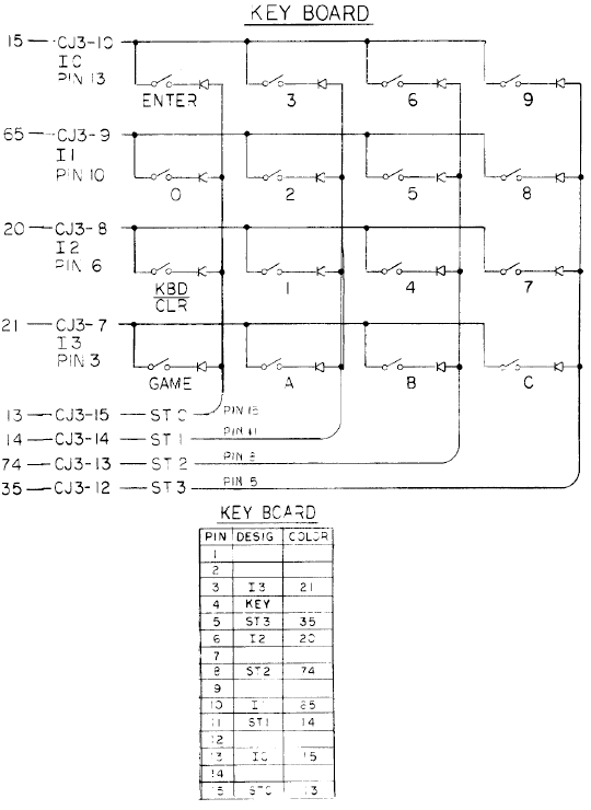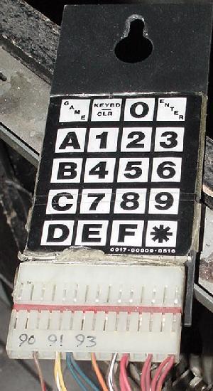 The Keypad - Portal to the Adjustments/Diagnostics. The 6803 keypad was an incredibly dumb idea. Bally's reasoning for it was, "It allows the operator to go directly to a function or adjustment, eliminating the tedious procedure of repeatedly press the self-test button to look at a certain adjustment. Of course pressing the self-test button gave the operator time to chat with the local repair expert and learn how he and Ernie always put chewin' gum on the legs to keep the game from slidin'." (No kidding, they really said that in the Eight Ball Champ manual!) With the keypad, just punch in the Register number on the keypad and the information is shown on the score displays (the "register" nomenclature was used on games with 7 digit score displays, prior to Motordome). That's all fine and dandy, but on games with numeric displays, going to some discrete unnamed numbered adjustment directly doesn't really help if the user doesn't have a manual with the list of Register numbers and their meaning. Also the keypad is connected to the game with a .156" Molex connector. Hence the keypad can become disconnected from the game and lost (finding a 6803 keypad for purchase is as rare as hen's teeth). If the keypad is missing, there is effectively no way to enter the diagnostics, audits, or adjustments!
