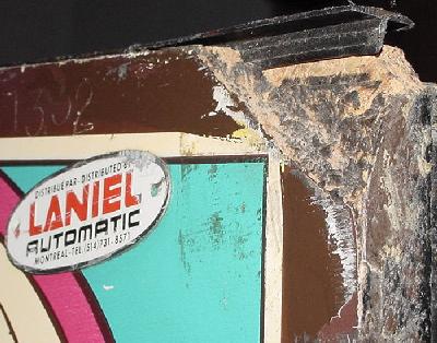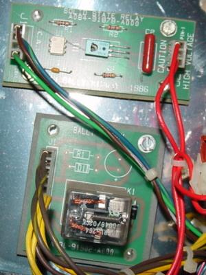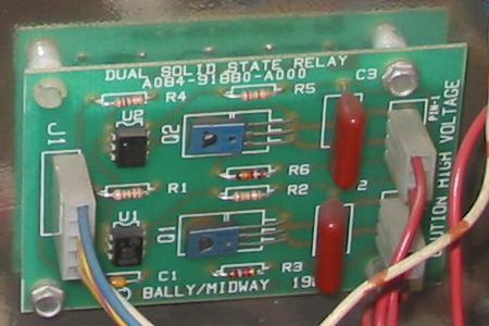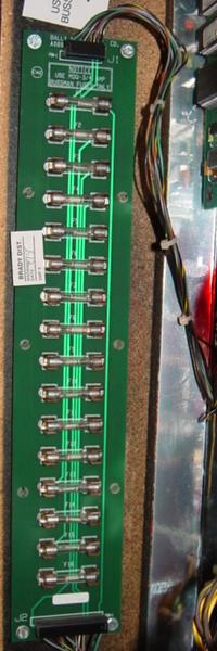 Bally also made a "banana cabinet" on Dungeons & Dragons, Escape from the Lost World and Blackwater 100. They were called this because the bottom cabinet sort of bends in the middle. The banana cabinet is a little difficult to use with a dolly, although there is a board across the back end of the cabinet for helping dolly usage. Many Bally 6803 games used a single incandescent or fluorescent light for the backbox lighting, and all the games used only 555 bulbs (no 44/47 bulbs anywhere). Also on some 6803 games in the backbox are a small board called the Solid State Relay board. This turns the backbox incandescent bulb on and off. And games such as Dungeons & Dragons, Special Forces, Escape from the Lost World, Heavy Metal Meltdown and Blackwater 100 also used an additional "fuse board", mounted on the left inside of the backbox.