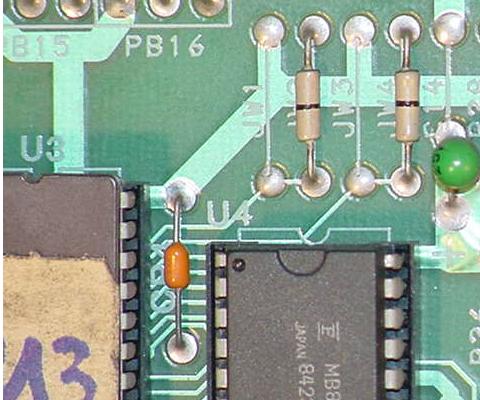Furthermore we need another small adapter, which will connect a 2200 ohm resistor between ground and U14 pin 19. The resistor is wired with two mini hooks to connect U14 pin 19 easily to ground.