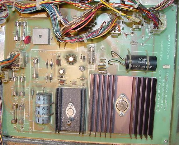 The game's main power fuses are located on the power supply board. With the power off, remove each fuse and check with a DMM set to continuity. Also check the fuse for the proper value and type (slow or fast blow). Replace as needed. The power supply board is nicely silkscreened with what each fuse does and its value. Upper left corner: