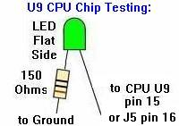 A "Good" U9 and U11. If your LED is locked on, and the reset circuit is working (see above), I would next invest in a new 6800 CPU for U9, and a new 6821 PIA for U11. You can buy these for just a few dollars. Get a couple extras of each chip. While you're at it, get a few 5101 RAM chips too (as these go bad a lot on the MPU board).