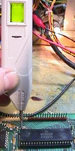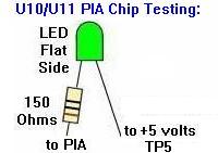 If one PIA output does not flash, temporarily connect it (short it) with the output pin next to it. This will cause one of two things - Both outputs "dance": this means the first output is dead and the 6821 must be replaced. If both outputs do not "dance": there is an short somewhere on the suspect output line. If this is the case, disconnect the output line by bending the PIA pin up and out of the socket, and connect the Tester LED to the extracted pin. If the LED dances, the 6821 PIA is OK and the short is somewhere on the MPU board. If the extracted PIA pin does not "dance", then the 6821 is dead and must be replaced.