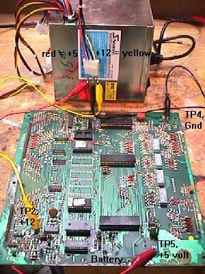 Be careful when you hook up the voltages to your MPU board. If you short +12 volts to +5 volts (for example), you will probably destroy all the chips on the MPU board! Also be careful when you hook up +12 volts to TP2. It is VERY easy to short TP2 to TP3. This may damage the MPU board too! (Unlikely, but let's not risk it). So be careful, and double check your connections before you turn the power supply on.