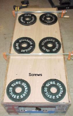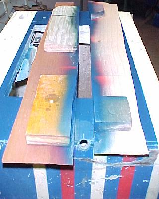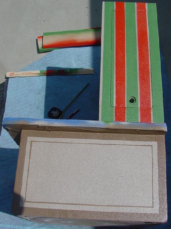 Spraying the Stencil Colors. After the stencil is secured to the cabinet, LIGHTLY spray the designs with some sort of spray paint. Spray just enough paint to cover, and no more. A common problem is spraying too much paint, and the paint pools at the edge of the stencil. Then when you pull the stencil off, the edge line is distorted from the pooled paint. Also several light coats is better than one heavy coat. When pulling the stencil off the cabinet, be careful not to smear the freshly sprayed paint. I personally like to remove the stencil when the stencil paint is still wet, otherwise the stencil can get stuck to the cabinet by the drying stencil paint. front stencil patterns are straight, I used thin and straight wood laminates as stencils (instead of cutting out stencils). The laminates are put in place, and weighted with some blocks. Then the paint is lightly sprayed, and the stencils immediately (and carefully!) removed. After this stencil paint dries, the next stencil area is painted.