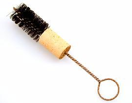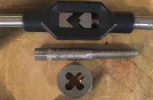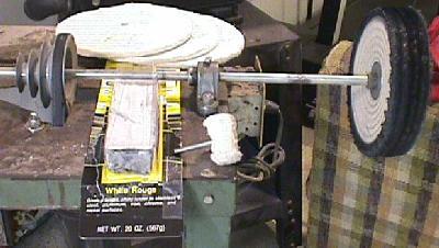 Your buffer could be as simple as a drill with a small chuck mounted wheel (see picture below, one is laying on the table). This works, but is not optimal. I got a drill mounted wheel at the local production tool supply house for about $5. It's 2" wide and 1" thick. Another alternative is to use a bench grinder with 6" wheels. Remove one of the grinding wheels and replace it with two or three 6" by 1/2" sewed buffing wheels. Since bench grinders operate at such high speed, you'll also need a foot operated power switch. Again, you can get this at a local production tool supply house. This foot power switch will allow you to turn the power off and on easily and in spurts to limit RPM's. I made a "real" buffer from a table and motor I got at a garage sale (see picture). The rest of the parts I purchases at a good hardware store. This included the metal rod (which I threaded on the ends with a 3/8"-16 die, available at a hardware store), the bushing blocks, the rod collars, the pully and belt, a couple washers and nuts. It works quite well. The key to power buffing is the white rouge. It is fine enough to give a great shine, but will cut pretty well too. I got this product in stick form at the local production tool supply house. well). These are 8" diameter and 1/2" wide (shown mounted and unmounted). Also available in 6" and 10" versions. Can use 6" version on a bench grinder, but must use a foot power switch to manually limit RPM. Can also use a drill mounted 2" diameter by 1" wide buffer wheel (shown). Use white rouge buffing compound in stick form (shown).