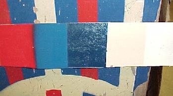 to match repaint colors. From right to left: Ivory, Antique White, Regal Blue, True Blue, Banner Red. These are most of colors needed for 1960's Gottlieb cabinets.
