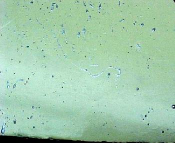 When you think you have a color matched, apply some to your small test piece of glass. If you don't have a test glass, just apply the mixed color to the FRONT of the backglass. Using the front of the backglass or a test glass is the best way to match the color. Let your sample glass dry (a hair dryer can be used to make the paint dry faster). The biggest problem with these craft acyrlic paints is they dry darker. So let the sample dry, and then compare it to the backglass color. Don't worry if your paint dries on the cardboard mixing pallet while you're waiting for your sample test glass to dry. Just dip your brush into some water, and put the brush on the dry paint. It will become liquid again as long as the paint has not dried for more than about 30 minutes. To clean your sample test glass or the front of the backglass (for the next color), just use a paper towel dipped in some water. touched up area? The two black dots give it away. They are from not properly cleaning the damaged glass areas before applying the Triple Thick. I probably should have chipped them out with an exacto blade before applying the green touch-up paint.