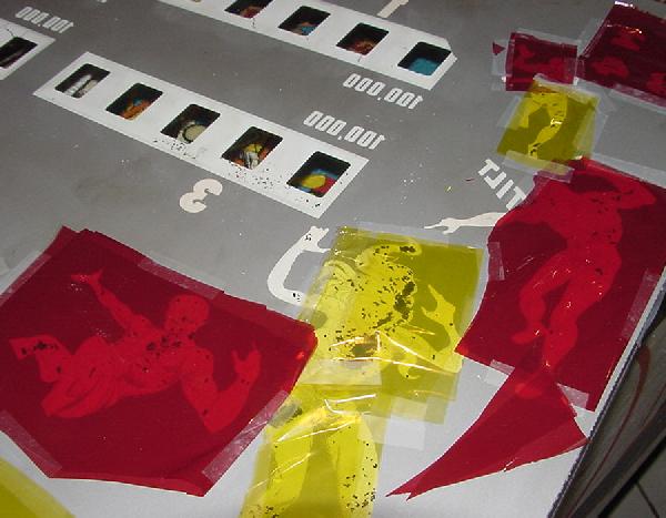 This step is optional, but I recommend it if you are happy with your touch-up work. Nothing looks worse than inspecting the back of a backglass, and seeing all the touched-up areas. They stick out. Putting silver acyrlic over these opaque areas makes the touch-ups far less apparent from the back of the glass. It has some effect on the front of the glass, in colors that are hard to apply opaque (like yellows). Adding the silver can stop additional light. Just dap some silver over the touched-up areas. Don't apply too much, and don't move the brush heavily while doing this. You don't want the silver to leach through the color applied before. All Done? An Alternative BG "Touchup" Method for Translucent Areas. But there is another less volatile way to do translucent backglass touchup. And it take a lot less time, is cheaper, and far less invassive. That's the good news. The bad news is it only works in the translucent areas of the backglass. For the non-translucent (opaque) areas, you will need to follow the steps outlined above using acrylic paints. First step is to clearcoat the backglass with Krylon Triple Thick (if you have not done that already). This is *required*. The second thing is you much run #47 bulbs in the backglass (the #44 bulbs are too hot). The next step is to go to Micheals and by some translucent colored cellophane. This comes in a 24" wide roll 1mill thickness, and in a variety of colors. Red and yellow are the most commonly used colors. Cost is about $6 per roll. Another alternative to Micheals is to get some Rosco Gels (Roscolux.) These are basically the same as the Micheals stuff, but come is WAY more colors. You can buy a swatch of them for $7.50 to make color matching easier. They are available from http://www.rosco.com/sbreqs/index.cfm. Also available is a kit with all most of the colors offered for about $35 from here. Next turn the backglass over (screened side up), and cut a length of the transparent cellophane. On the red you will need to 'double up' the cellophane, folding it in half (for less transparency). With yellow cellophane you have to go even further, using at least 4 layers if not 8 layers (the yellow is far more transparent than the red). After the cellophane is cut to the approximate size you want, covering the area desired, just Scotch tape it in place. I use a quality 3m tape as it's more durable, but anything will work. Now install the glass in the game and turn it on. If the lights are "too bright", I often remove a couple bulbs to decrease the amount the light. This often really helps. This is not a perfect solution, but it's easy and non-invassive. And if you want to reverse it just peel back the cellophane. the translucent parts of the backglass. Note the backglass has been clearcoated with Krylon Triple Thick. Pretty ugly, but it works well.