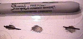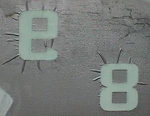 So you think you have the color matched correctly? Now is the time to apply it to the backglass itself. If you are unsure about where to paint the new color on the back of the backglass, use a black Sharpie on the *front* of the backglass to outline the area to touch up. Brush the new color on fairly thick, but try NOT to overlap the paint past the area it needs to go. Don't make a big mess here. Let the area dry and flip the glass over and check your color match. Not Happy with your Work? touch-ups and the black Sharpie line. Right: the backglass after silver has been applied to the touched-up areas. This makes the touch-ups less apparent from the back, and makes the area less translucent.