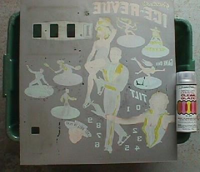 After the glass is dry from cleaning, it is time to spray the Triple Thick. Put the backglass flat on a solid surface. If the backglass ink/paint is really delaminating, I spray the first coat of Triple Thick about 18 inches from the glass, and move the can very quickly. This will provide a "misting" coat to get the delaminating paint to stay in place. Then let this coat dry a minimum of 30 minutes. A repeat of this quick and distant application may be required. If the backglass is not delaminating, my first coat is about 12 inches from the glass, and I move more slowly, applying more clear in a "wet" overlapping coat. If the backglass is heavily peeling, please skip down to the secition below, Saving a Severely Peeling & Flaking Backglass. After the first coat(s) of Triple Thick is down and dry for at least 30 minutes, I spray one or two more "wet" coats. The first coat of Triple Thick should have all the backglass paint solid and in place. So the "wet" coats can be applied with the spray can much closer to the glass, laying down much more Triple Thick again in a "wet" coat. Spray the coats in perpendicular directions if possible. That is, spray left to right on the first coat, and then up and down on the second. I find that at least 30 minutes of dry time between coats is needed. A common question is, "how much Triple Thick do I need to apply?" Generally speaking, two wet coats is all that is needed. Do not go wild and apply more than that. Too much Triple Thick can be a bad thing (but also too little Triple Thick does not really protect the backglass). On backglasses with score reel windows, if they were not masked before spraying, they can be razor bladed to remove the Triple Thick. Note if the proper amount of Triple Thick was applied (not too much!) and the windows were clean, I often leave the score windows with the Triple Thick on them. If you did a nice job spraying, usually the Triple Thick can not be seen. If this is not the case, after 30 minutes of drying time on the last coat, use a razor blade or exacto knife and score the outside edges of the score reel windows. Do this about 1/8" on the inside edge of the paint. This allows the new finish to overlap the backglass paint. If you allow the paint to fully dry before scoring it (not recommended!), heat your razor blade or exacto blade so it is hot, then score the paint. The heated blade will cut the clear coat much better. After scoring the new finish, scrap/peel the clear from the windows. Use the razor blade for this job (or a razor blade broken in half). I usually do *not* razor the credit window. When complete, let the glass dry overnight. Then use Novus#2 on the score windows to remove the "edge" from razor blade scraping. Saving a Severely Peeling & Flaking