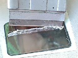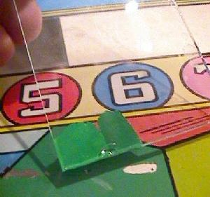 Thick"! I have probably Triple Thick'ed 100 backglasses, and have never had a problem. But I get emails from people that just can not do this even once without having issues. They either put the Triple Thick on too heavy or too thin, and just make a mess out of an other good condition backglass. If you can't put a good professional looking finish on a piece of flat metal using a rattle can, then you have no business applying Triple Thick to a pinball backglass. After applying Triple Thick, the coating on the back of a score glass should be shiny, glossy, and smooth. There should be no overspray misting or separation of the backglass film. It should look good! Practice on a junk backglass first if you have any doubts. Preparing the Backglass for Triple Thick. To clean the painted side of the backglass, take a paper towel and spray the paper towel with Windex (don't soak it!) Never spray Windex directly on the backglass. Spray the Windex on the paper towel. Now gently wipe the score windows and credit window. After doing those, *gently* wipe any other "solid" (not delaminating) sections of the backglass. Remember, don't go nuts and cause more problems. "The enemy of good is better" is something that should be repeated while doing this chore. Examine the paper towel for crud or potential paint loss. See all the dirt on the paper towel? Removal of this crud really helps the Triple Thick "stick" to the backglass ink/paint. On backglasses with score reel windows, a business card can be cut and layed over the clear score reel windows. Use a penny or a nickle to hold the card down. This is optional (often I just spray over the score windows completely). Left: Score the score windows with a razor blade.