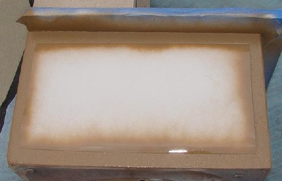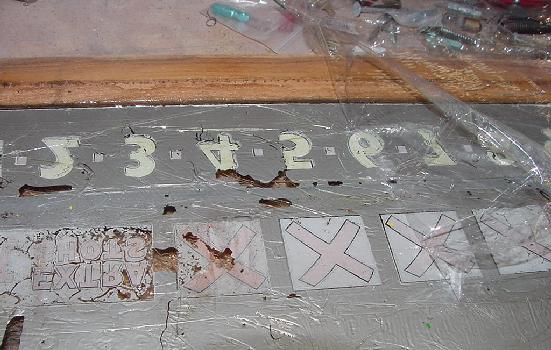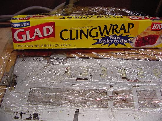 After the Cling Wrap is on top of the wet Triple Thick, press the clear wrap down with your fingers in any area where the backglass ink/paint is peeling. Actually push down the peeling paint. Paint chips can even be shifted and moved slightly if you are careful. The ClingWrap will keep your fingers separated from the wet Triple Thick. After all the paint is pushed down and into place, leave the glass alone (do *not* try and remove the ClingWrap!)