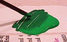 If you are attempting a major re-paint of a glass that is REALLY gone, here's a tip. Use your Sharpie pen, and draw in the backglass design's outlines on the FRONT of the glass! When done, flip the glass over, and fill in the missing areas with colored paint. It's kinda like painting-by-numbers now. After that dries, remove the black Sharpie lines from the front of the glass with some Windex. Step 3: Mixing the paint. Mix the paint on a piece of scrap cardboard or plastic. Note if you use porous cardboard, the paint may dry quicker on the pallet, as the cardboard absorbs the water from the paint. You can also use the top of an old margarine tub or mix the paint in a 35mm film container. Then just put the lid on, and the paint won't dry as quick. Just squeeze out the colors from the bottles, and mix it with the end of your paint brush. Also have a glass of water and some paper towels nearby. When done mixing, wipe off the end of the brush on a paper towel. I usually start with a darker color than I need. Then I add a touch of white or the same color pastel to lighten it. Alternatively, you can start with the light pastel color and add a dap of the deeper color or black to darken it. But be careful trying to darken a color with black. For example, adding a touch of black to green will make it darker, but it also makes the green "blacker" in the process, and not really "greener". It's much easier to darken a pastel with a deeper version of the same color. It's a lot easier to lighten a color doing the reverse. Add other colors as needed to change the overall shade of the color. The color on the left is the green straight from the bottle. The color on the right is the same green with a touch of black added to darken it.