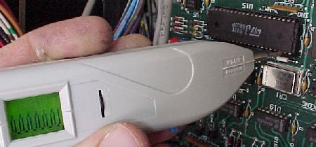 Testing the lamp matrix rows using two test leads, a 555 socket