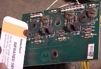 Optos have two sides to them: a transmitter, and a receiver. The transmitter is the part that fails 95% of the time. Essentially the transmitter is a light bulb, and all light bulbs burn out eventually. And the optics are always "on", even when the game is in attract mode (another good reason to turn your game off when not in use). A nice tool to have in your tool box is a infrared detector card. Available from Radio Shack or MCM Electronics part# 72-6771 (800-543-4330 or www.mcmelectronics.com), this $7 credit card sized card will show if the optic transmitter is producing light. Without this card, you can not see this wave length of light (well a digital camera can be used to see the optic light too). So this handy little card is quite good to have. Remember you must have the card positioned in front of the transmitter to see the light on the orange colored band (having it in front of the receiver won't show anything!). The "red" side of the "U" shaped opto is the transmitter side of the optic.