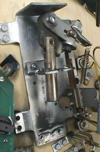 The flipper pawl assembly can now be rebuilt (if you buy a whole new flipper pawl assembly with a new plunger/link for about $10, skip this section). Remove the allen bolt that holds the flipper plunger/link to the pawl. The plunger/link can now be removed (you may need to use a screwdriver to spread the pawl assembly slightly to release the plunger/link).