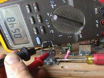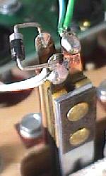 You can test the diode on a microswitch without unsoldering a diode lead from the switch. This technique assumes the switch is wired in the standard configuration: green (ground) wire to the center lug, the banded end of the diode to the far switch lug, and the non-banded diode lead and the switch wire(s) to the close switch lug (as shown in the pictures above).