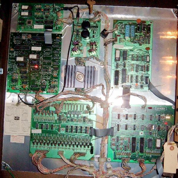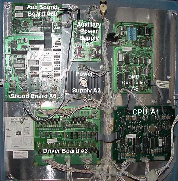 The A6 sound board has two 65C02 processors, a dual DAC (digital to analog converter), and an import port to receive signals from the CPU board. The sound board requires +5, +12 and -12 volts DC and a power-up reset signal from the CPU board (pressing sound board SW2 will give a manual reset). There are two 27256 EPROMs (the D1 and Y1 PROMs as Gottlieb calls them). This board is responsible for all the music and non-voice sounds. The Auxiliary sound board A20 is the smaller of the two sounds board, and has a YM2151 sound generator and a MSM6295 sound/speech generator. Gets commands from the CPUs on the A6 sound board. This board has two 27020 or 27040 EPROMs (the A1 and A2 PROMs as Gottlieb calls them). This board is responsible for all the voice tracks. The game will work without this board, but of course there will be no speech.