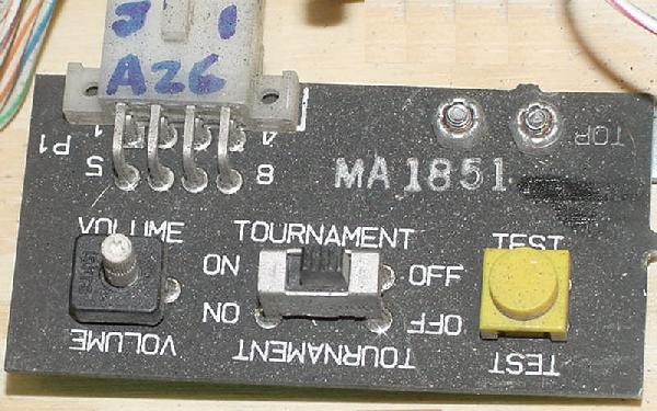 2f. Built-in Diagnostics and Audits. Inside the coin door is a small A26 diagnostic board with the game's sound volume control, a tournament toggle switch, and a yellow push button switch. The push switch is what puts the game into audit/adjustments/diagostics mode. Pressing this switch three times will put the game into diagnostic self-test mode. Pressing the yellow Test button will advance from each of the nine self-test modes.