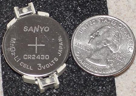 Though this battery (a lithum CR2430, 3.2 volts at 270 mAh, 24mm x 3mm) is easily bought at Radio Shack, the original is soldered to the CPU board. The ones easily found are not a solder-in type. Hence the best approach is to get a solder-in socket for this battery, so in the future the battery can be easily replaced (don't try and solder leads to a CR2430 battery - the battery can explode!) The "+" hole can be used for the socket's positive leg. But the negative socket leg will need to be soldered directly to the ground trace of the CPU board below the battery (see the picture below). The 24mm CR2430 3.2 volt lithium battery is available from Mouser.com part# 639-cr2430. The solder-in 24mm socket for the CR2430 battery is available from Mouser.com part# 614-hu2430-1.
