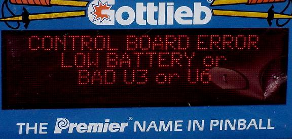 If the round flat 3.2 volt battery on the CPU board dies, the game will not boot past a message on the score displays stating, "Control board error, Low battery or Bad U3 or U6". Most often the problem is simply a dead battery.