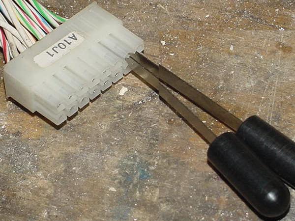 System3 Flippers. 1f. Getting Started: Connnector Backbox List & Usage Gottlieb solidstate games have had a history of problems. System1 and System80 used primarily card-edge style connectors (combined with battery leakage) that causes all sorts or reliability problems. Fortunately with Gottlieb System3, connector problems are largely a thing of the past. Gottlieb used a new style of connector that has excellent reliability. This is called the Molex "Mini-Fit Jr." 4.2mm (.165") series of connectors. Part numbers for Sockets (Female pins), wire size 18-24 Tin plated Berylium Copper #39-00-0060. Wire size 18-24 Tin plated Brass #39-00-0039. Part numbers for pins (male), wire size 18-24 Tin plated Berylium Copper #39-00-0062. Wire size 18-24 Tin plated Brass #39-00-0041. About the worst I can say about the System3 connectors is their lack of individuality (it's easy to mis-connect them, because they are not keyed very well). Pin removal of these square-pinned connectors is different than other pinball style connectors. There is a specialized tool for this job, contact extractor part# 11-03-0044 (about $20). But I ended up using two Molex card edge pin extraction tool part# 11-03-0016 to remove the square female pins from the connector housing. I'm sure this isn't the best method, but it did work without damaging the terminal pin.
