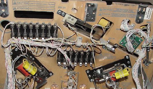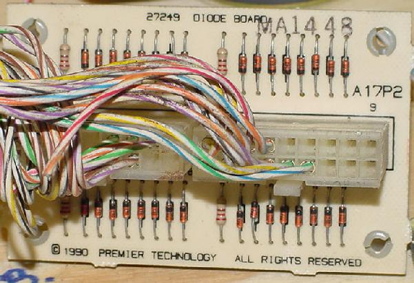 Gottlieb took a different approach to playfield switch diodes than Bally or Williams. Instead of mounting the playfield switch diodes right on the switch, they prefered to mount them on a separate board. This board was mounted under the playfield, usually near the outhole. Having the diodes on this board meant changing a switch was rather mindless; there's not special wiring (or even a diode) needed to install a new switch, and no wires to mix up. Also cracked diodes from vibration are much rarer when the diodes are separated from the switch. The downside of this approach was if there was a switch diode problem, the user would have to figure out which diode on the switch board applied to the switch in question.