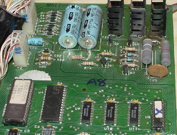 2L. Sound Problems. If either both Auxiliary sound power fuses F10 and F11 are blown, no sound will work in the game. If only one Auxiliary sound power fuse is blown, usually the sound will still work (just not as loud). Auxiliary Power Supply holds the sound amplifiers (TDA2040, but can be replaced with the less powerful TDA2030). Also the op-amp MC3403 (or LM324AN or NTE987) can be blown, along with the LM340T (or 7805) +5 voltage regulator. If the game boots with the "dual tone squelch" than the sound boards are working. The CPU board's A1P4 connector must be in place or the CPU board can not talk to the Sound board. If this conector is removed, the sound board won't boot properely and there will be no sound. 2m. Misc. Problems and Fixes