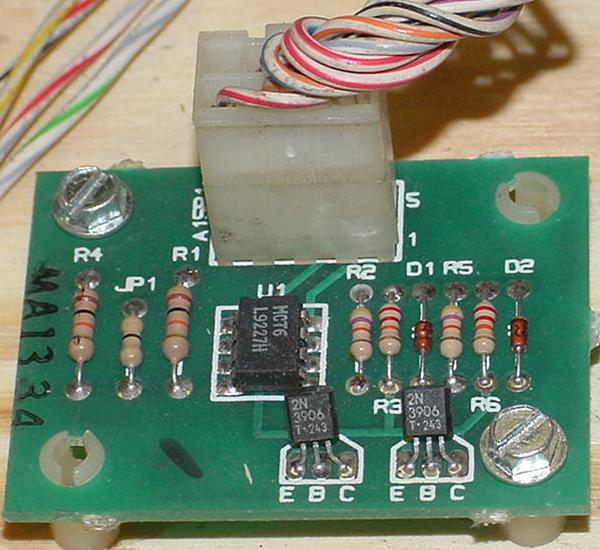 Mounted under the playfield, a small board is used to sense when the flipper buttons are pressed. The voltage stream is seen but this board, and is converted thru an opto isolator and two 2n3906 transistors. This tells the CPU's switch matrix that the left or right flipper buttons have been pressed.