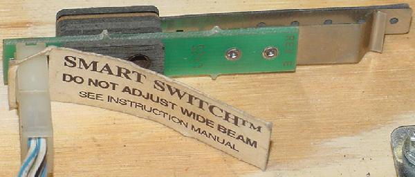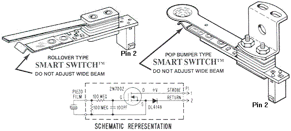 Smart Switches (Piezo Film Sensor). There are some Smart Switch differences. The green pcb SS is for stand-up targets and rollovers. The blue pcb SS is for the pop bumpers only. They operate in inverse. The green pcb switch operates on return of the piezo film. The blue operates on initial flex of the piezo film. This was done to get the proper action from the pop bumpers. You can interchange them but it's not a good idea. For example, the pop bumper blue version causes short kicks when used in a kickback lane, as the plunger is extended too soon. Though the Smart Switch is a cute idea, I am not entirely sold on it. To me it is a bit like engineering for engineering sake. Luckily though, Smart Switches are downward compatible to regular switches. So if a Smart Switch fails, it can be replaced with a normal blade or micro-switch (without a diode, as all Gottlieb switch diodes are remotely mounted on an under-playfield mounted diode board). Sometimes there are questions on the Gottlieb Smart Switch as to what is pin 1 (strobe) and pin 2 (return). Hold the switch with the green pcb facing you (the side of the pcb with no components). If you have the switches that use the connector, the lock tab will be on the right. The lock tab side is the return side (pin 2), and there should be two wires in that connector hole. If you have no connector the right side is still the return side (pin 2). There is also a rib on the pin 1 side of the plastic connector and plug with a little "1" on the back of the plug on the tab that extends outward opposite the locking lever, denoting pin 1.