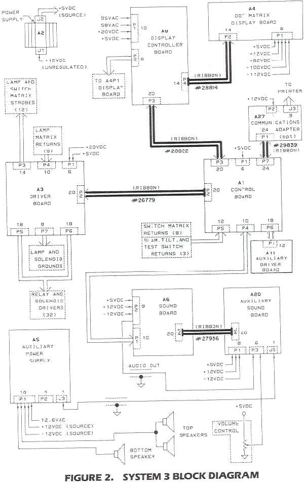 First thing to try is to reseat all the ribbon cables that go between the boards in the backbox. These have gold plated pins on the circuit boards, and the connectors themselves are usually not gold plated. The dis-similiar metals require a cleaning by reinsertion. These ribbon connectors are rated at 100 cycles (insertion/removals), so this is an acceptable way to 'clean' the ribbon connectors (note this is not acceptable on .156" and .092" Molex connectors). In regards to ribbon cables, often the problem can be the ribbon cable that goes between the driver board and CPU board. If this cable is bad (this is fairly common), garbage on the display can be the result. One solution to this problem is to install a .1 mfd 50 volt non-polarized ceramic capacitor from U1 pin 40 (reset) on the CPU (A1) board to ground. If you are paranoid about soldering on the CPU board, the reset is also connected to connector P7 pin 1 (unused, for serial printer adapter) on the upper right side of the board. P7 pin 23 is a ground. So female .093" Molex connector pins can be soldered directly to the legs of the .1 mfd cap, with heat shrink tubing on the exposed cap leads. Then this cap connector an be plugged directly into P7 pin 1 and pin 23(top row-first and last pins). Leave the leads long enough to bend the body of the cap over the top of the connector so it would be out of harm's way. The problem with the capacitor solution is this is not really fixing the problem. It is enabling the WDOG inhibit circuit (A1P1). A better approach is to find the actual fault. Also sometimes the capacitor will not solve the power-on garbage problem, but sometimes it will. It can work flawlessly, or it can work intermittently with this modification.