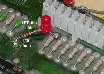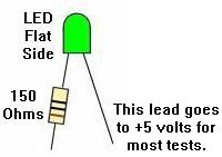The "tester LED" needs to be contructed using a LED and a 150 ohm resistor. Solder the resistor to the FLAT SIDE of the LED. A wire can be soldered to the non-resistor leg of the LED (or just connected an alligator test lead). The wire or alligator test lead will then (normally) be connected to +5 volts. Use the resistor lead on the LED as a test probe lead. I personally have found it easier to probe with the resistor side of the LED, hence the tester is assembled in this manner.