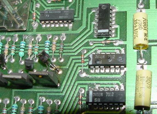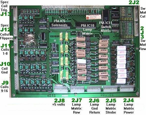 Solenoid Driver Test (Connectors 2J9,2J11). If the alternating signal is missing on any connector pin of 2J9 or 2J11, yet all the IC5 PIA signals are present, check the output of chips IC1,IC2,IC3,IC4 (7408 pins 1,2,4,5,9,10,12,13). if any are missing, the chip as failed. If all alternating signal is present, there is a failed predriver 2N4401 (Q14,Q16,Q18,Q20,Q22, Q24,Q26,Q28,Q30,Q32, Q34,Q36,Q38,Q40,Q42,Q44) or driver TIP120/TIP102 transistor (Q15,Q17,Q19,Q21,Q23, Q25,Q27,Q29,Q31,Q33,Q35, Q37,Q39,Q41,Q43,Q45).