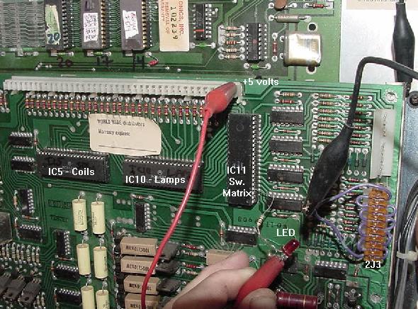 Lamp Matrix Row Test (Connector 2J7). In addition, this test also requires a ground connection to any pin of driver board connector 2J6 (if the boards are installed in the game, just have the game connector attached at 2J6). Once power and ground are applied to the lamp matrix, now connect the tester LED's non-resistor lead to +5 volts. Using the resistor lead of the tester LED, probe on each pin of driver board connector 2J7. The tester LED should alternate on and off, in unison with the blinking LEDs on the CPU board. If the alternating signal is missing on any connector 2J7 pin, yet all the IC10 PIA signals are present, check the outputs of IC19 or IC12 (7406) on the driver board (pins 2,4,6,8,10,12 of IC19 and pins 2,4 of IC12). If there is no output signal, the chip is bad. If the output is good, there is a bad 2N5060, 2N6427 or 2N6122 transistor.