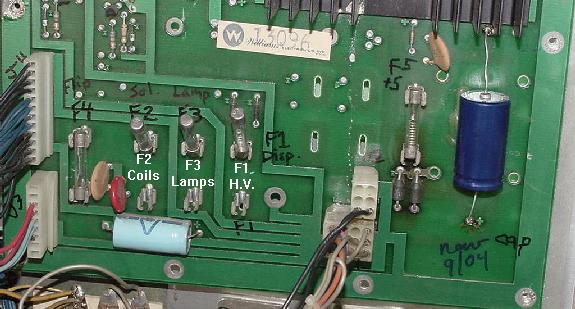 Before Starting... Before removing any boards from the game, and assuming the power supply is working, it's time to do some preliminary diagnostics. Remove the game's backglass, so the CPU board's LED(s) can be seen (if the CPU board in question is not in the game, it can be powered up "on the bench" with an external +5 volt power supply, those details are below). Right now, before doing anything, remove fuse F2 (solenoid power) and fuse F3 (lamp matrix power) from the power supply board. Now go ahead and power the game on, keeping an eye on the LED(s) on the CPU board. Here's a list of what could happen: