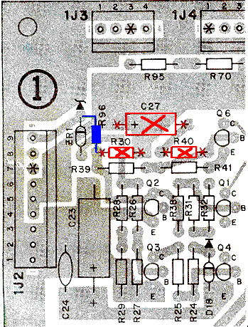 System3 CPU Board Reset Modification. Below is a diagram from Williams of this modification. The three red components are the ones to remove, and the blue component is the resistor to add.