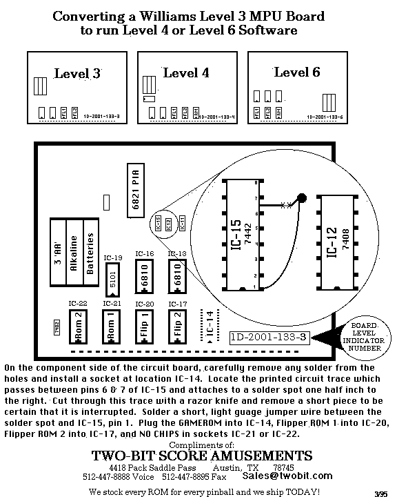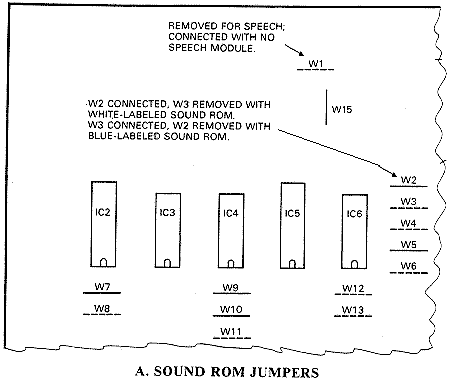 * Hyperball sound board note: The above information is different than the information which came from Williams. But the above jumpers have been confirmed as correct! Note a 6802 sound board processor can be installed and the old 6808 and 6810 RAM (IC11) removed. To do this, a trace must be cut on the back of the board below R30. It looks like Williams had a bit of a conflict of interest here because the pull-up resistor is in place for the processor swap but the resistor is permanently grounded until the trace is cut.