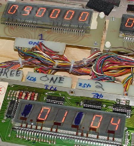 At Power-Up, the LEDs or 7-Segment Display Does not Come On. If there's no +5 volts at the CPU chip, then trace back through the power circuit to see where it's losing power. Check to make sure there isn't a short to ground. There are capacitors (.01 mfd non-polarized) at the Vcc (+5 volt) connection of each chip on the board to ground. Check each one of these for a short. Also check the board very carefully for solder splashes. Remember a prior repair may have gone bad and the board was junked for this reason. On System3 to system6 boards, check for +5 volts at IC2 pins 2,5,16 (the 8T28 that drives the LEDs). Also remember both LEDs could be bad! The LEDs will always come on at power-up unless turned off by an executing program on the CPU board. If there is proper voltages on the board, but no voltage at pins 2 and 5 of IC2, check for a running CPU chip (see below). If there is CPU activity on the address and data lines, then the problem is most likely IC2 (8T28) on system3 to system6 boards. On System7 CPU boards, if there is no activity on the 7-segment display, it is common for IC34 (7447) segment driver chip to fail. This will give a false indication that the board is completely dead or that there's no power. Using a logic probe, test for pulsing at IC1 pin 15 of the CPU chip. If there is activity there, then the problem is most likely IC34 or the segment LED itself. Also if the LED comes on and stays on (even though the game is seemingly working fine), often IC2 (74125) has shorted internally. Note two test LEDs (like on system3-6 CPU boards) can be added to the System 7 CPU board. This will allow testing to the board before replacing IC34 and/or segment LED. All that is needed is two LEDs and two 100 ohm 1/4 watt resistors. Solder the two resistors into the board, just to the left of test point TP9. The LEDs then should be soldered into the two top pads pairs next to the segment LED, with the flat side of the LEDs towards the 7-segment LED. With the two LEDs installed, they will "flash" just as the LEDs flash on system3 to system6 CPU boards.