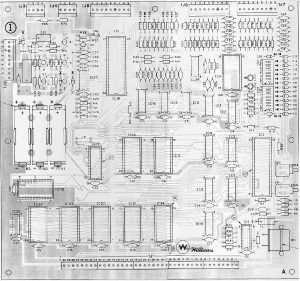 Introduction to CPU/Driver Board Repair. System3 to System7 games were designed so that a field tech would only have to swap out a failed board, and then send the board to the distributor for repair. The boards were not designed to be diagnosed and fixed on location. Looking at the Williams "repair" manuals, the instructions tell pretty much only how to pinpoint which board is bad. The final "fix" of most repair steps in a Williams manual is to "replace the board". Unlike more recent games which report many problems, early Williams board provided little diagnostic help. This was unlike the approach Bally took with their famous "seven flashes" diagnostic system (which makes component level repair pretty easy). Where Bally took the approach that the boot-up diagnostics were very important and game diagnostics were not, Williams took the opposite approach that boot-up diagnostics were *not* important but game diagnostics were! Hence 1977-1985 Bally games have the famous power-on seven flash test, but don't really have a lamp, display, coil or switch test. Williams system3 to system7 games have basically no significant power-on test indicator, but do have good versions of lamp, display, coil and switch tests (assuming that the Williams game in question will boot up properly!) Initially, when these games were new, Williams pinballs were dependable, about as good as Bally games (and better than Gottlieb' system80). But after a few years, as the Scanbe sockets got old and the 40 pin interconnector wore, dependability of these games made them way worse than Bally (and probably on par with Gottlieb). And with no power-on indicator system like Bally had, operators didn't even know where to start with a Williams repair. It's not that the Williams system is "hard" to fix, it's just time consuming. Where the Achilles' heel of the Bally system is battery corrosion and Gottlieb had board connector and ground issues, Williams System3 to System7's Achilles' heel is the design of the boards themselves. Passing address and data lines over a 40 pin .156" Molex interconnector is a bad idea. If *any* address or data line drops out for even a millisecond, the whole game locks up. Same thing with the Scanbe sockets; if a single pin become intermittent on any Scanbe socket, the game locks up. Add vibration to the mix, and things only get worse. Having some PIAs on the CPU board and some PIAs on the driver board forced the address and data lines to cross the two boards at this Achilles' heel (the 40 pin interboard connector). And if the game locks up when a coil is energized, that can take out more components on the driver board, making the repair even worse. Also some components on the Williams System3 to System7 boards are obsolete and unavailable. For example, the System3/4 clock chip (MC6875) is obsolete and impossible to find. This is the companion clock chip to the 6800 CPU processor. Luckily, the MC6875 doesn't fail too often. Also the 8T28 and 8T97 chips are discontinued (there is a work arounds for most of those). But this is why many repair facilities will not repair Williams System3 or System4 CPU boards. To make matters even worse, the software contained in the "flipper ROMs" (essentially the operating system) adds to the problems. If any of the PIAs can not be found in the exact state the software expects, this locks up the software, and hence the entire game. So say the solenoid PIA is partially dead (common, because of a locked-on driver transistor which cascaded back to the PIA and damaged it). This may make a coil or two not function. That's fine; the game maybe could still be operated and played without a bumper or two. But instead, the whole game locks up and becomes useless. And because the CPU is locked up, diagnosing the problem becomes very difficult too. To add insult to injury, the driver board is an integral part of the CPU board. That is, the CPU board will *not* run without a functioning driver board attached! (Unless a special test EPROM is used, which has only recently became available.) So the whole theory of spliting the system into smaller components (a separate CPU and separate driver board) for easier diagnostics is missed*. The two boards need each other, and are linked together through the incredibly stupid and troublesome .156" 40 pin interconnector. This is unlike Bally and Gottlieb, where their CPU boards can be run independently of the driver board, making diagnosing problems much easier, since the system can be broken down into smaller, more managable pieces. * Note there is a trick that allows the Williams CPU board to (semi) boot without the driver board. The driver board can be completely removed from the game, and the CPU board booted. If the CPU board is OK (trying to run), the two CPU LEDs will blink on, then go off, and then come on steady (since the CPU board is looking for the Driver Board). If installing the Driver Board locks the CPU (LEDs steady on, no blinking at bootup), then the CPU board is probably Ok (and there's problems on the Driver Board.) On a system7 CPU board, if the CPU were OK (or trying to run) the Numeric Led would blink �0�, go off and come on steady (looking for the Driver Board). If putting the Driver Board back in locks up the game ("0" steady on), then there are some problems on the Driver Board