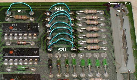 Since the driver board is already removed, it's a good idea to upgrade System3 to System6 driver boards to be upward and downward compatible from System7 to System3. To do this, replace the 1000 ohm (system3) or 330 ohm (system 4-6) resistors R204-R211 in the upper right hand corner with zero ohm jumpers. System7 driver boards already have this modification done. The decrease in these switch matrix resistor ohms was done to increase the current drive through the switch matrix. For example, if a switch or connector was dirty and had slight resistance, the switch could still be sensed by the CPU/Driver board. There is a rumor that using a jumpered system7 style driver board in a System6 or earlier game may result in random switch closures during game play. This does not seem to be the case (but keep it in mind if having random switch closure problems). One thing for sure though is using a non-jumperd System3 to system6 driver board game in a System7 game will definately result in switch closures being missed. Part of the problem Williams was having with switches was due to an assembly mistake, which started in the mid-1970s (pre-solidstate). It turns out Williams was assembling one of the pair of leaf blades backwards. This was not a huge deal with Electro-Mechanical (EM) games, but with solidstate games, it was a BIG problem. Because solidstate games use low voltage (5 volt) switches (unlike EM games in which all switches were high voltage 28 volts), the contact rivets are gold plated to help keep them clean (gold is a non-corrosive metal). But because one of the switch blades was reversed, a gold plated switch rivet made contact with a gnarley rough non-gold plated switch rivet. Problems occurred mainly with any switch where a ball "sat", like the ball trough, lock or kickout hole. This mistake was not realized until the Firepower era, and Williams offered retrofit kits for Firepower and Black Knight ball troughs using microswitches to fix the problem.