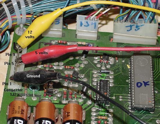 After the power supply is obtained, power it up and figure out which wires are the ground COM (usually black), +5 volts DC (usually red), and +12 volts DC (optional, but usually yellow). Use a DMM to test the voltages. Turn the power supply off. Now get three alligator clip test leads, and hook up the power supply to the CPU board's connector 1J2 as follows: