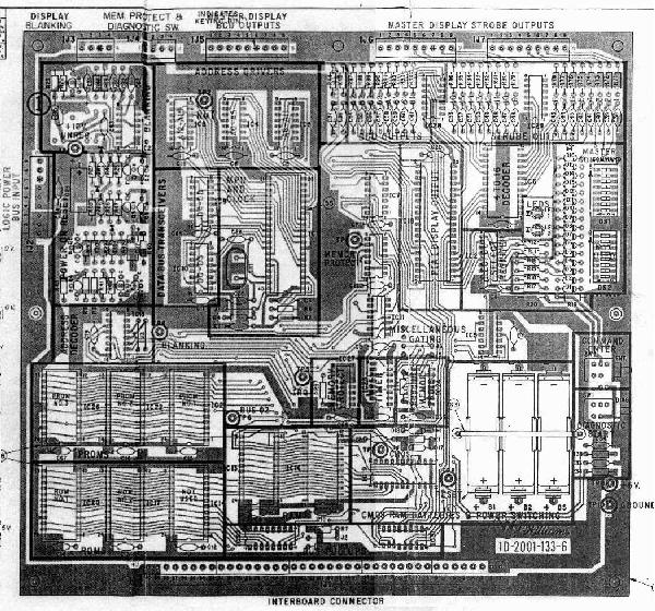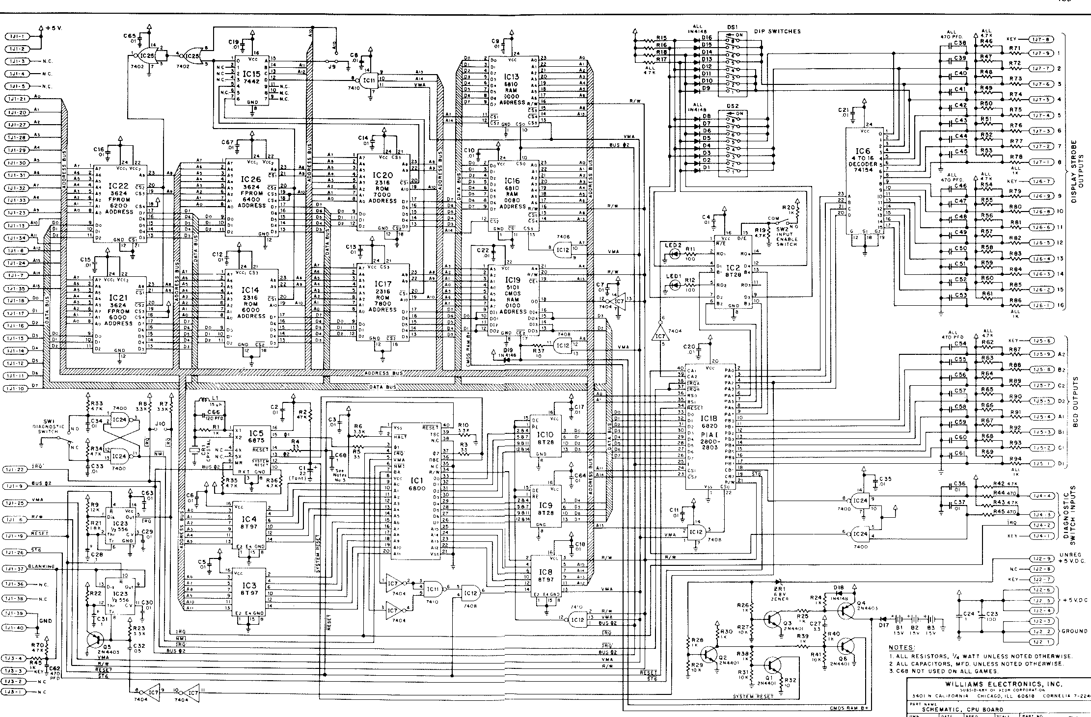 The Read/Write lines. The Valid Memory Address line. The 6800 series of microprocessors do not always place a valid memory address on the address bus, so a VMA signal is required to verify a valid memory address. The VMA line is high whenever a valid address is placed on the address bus, and is used as part of the chip selection circuits. If the VMA line never goes high, then a memory address will never be selected. The VMA line originates on the IC1 pin 5 CPU chip, and passes through the data buffer chip IC8 pins 13,14 (System 3/4 CPU boards have some additional logic chips on the CPU side of the VMA line, including IC7, IC11, IC12). Check the VMA at the IC1 pin 5 CPU chip and IC8 pin 14, as these pins should be high.