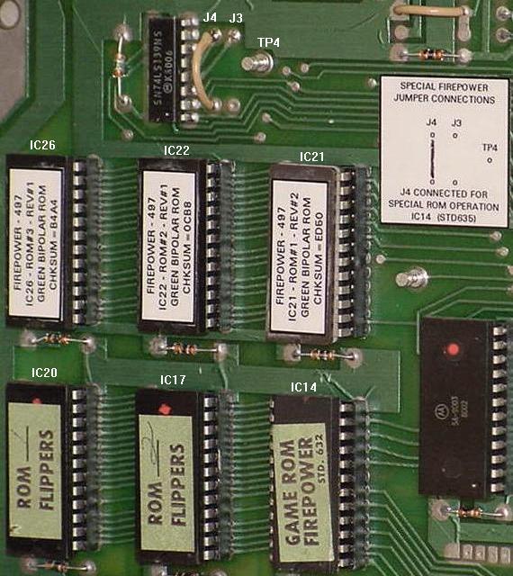 Using the Firepower EPROMs in a System7 CPU Board. For the technically oriented, the System7 EPROM configuration uses the original 2716 System6 IC14 Firepower EPROM on the System7 CPU at IC20. The new System7 2716 IC14 EPROM is a binary copy of the three original 512 byte PROMs (that lived at IC21+IC22+IC26 on the System6 CPU board). And of course the 2532 Flipper EPROM at System7's IC17 is a binary copy of the two original "green" Flipper EPROMs, as described above.