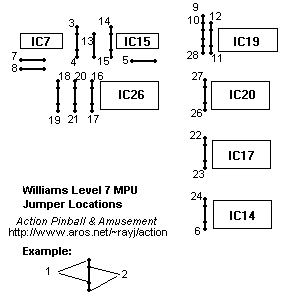 By far the most versatile CPU board in the System3 to System7 era is the System7 CPU. It can run any System3, System4, System6 or System7 game firmware. It can also drive a six digit or seven digit master score display panel. So if there's one CPU board to have, it's the System7 board. The only caveat to this is System3 to System6 game firmware needs a special Flipper ROMs for the System7 CPU board. The two White (system3), Yellow (system4), or Green (system6) 2716 Flipper EPROMs need to be combined into a single 2532 EPROM, which will plug into socket IC17 on the System7 CPU board (the existing system7 Blue Flipper ROMs will not work with the older system3 to system6 games). The stock System3 to System6 2716 Game ROM (IC14) can be used on the System7 CPU board at IC14 (the only except to this statement applies to Firepower, see below). All other EPROMs should be removed from the System7 CPU board. The best part is no System7 CPU jumpers need to be changed for this configuration (assuming the System7 CPU board is set for any game other than Hyperball/Defender). For example, to combine the two "Green" 2716 Flipper EPROMs into a single 2532, the following MS-DOS command can be executed: copy /b grn1ic20.716 + grn2ic17.716 grn_ic17.532This MS-DOS command does a binary copy of the Green1 (IC20) Flipper ROM, adding to the back of it the Green2 (IC17) Flipper ROM, and putting the two separate 2716 files into a new combined 2532 file. The same thing can be done for the White and Yellow flipper ROMs, and for the special World Cup Flipper ROMs. If preferred, these files have already been copied and can be downloaded by clicking here: System3 to System6 Flipper ROMs for the System7 CPU. Again remember, the stock System3 to System6 2716 Game ROM (IC14) can be used on the System7 CPU board at IC14 (the only except to this statement applies to Firepower, see below).