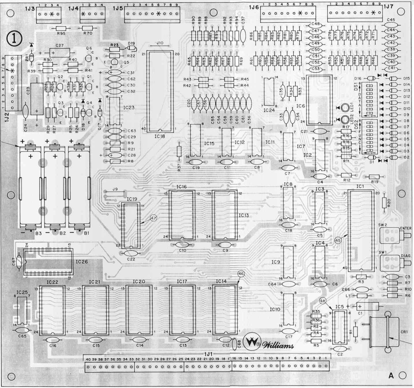 The Internal System3-System7 Diagnostic Firmware. To make matters even worse, the diagnostic SW1 test, even on a working CPU board, can confuse even a veteran user. The diagnostics are a memory test only, and tests the CMOS RAM IC19 (5101) and the two static RAM chips (IC13/IC16). But the static RAMs IC13/IC16 rarely die. And the user will already know if the CMOS 5101 RAM is dead well before the diagnostics are run. If the game boots into "audits" mode, and the CPU batteries are good, it's 99% for sure the 5101 RAM is dead. Also, even if the CPU board has seemingly "booted correctly", the flipper ROMs IC17 and IC20 can still have problems. These two ROMs hold the diagnostic code, and if one of these ROMs has a problem, false indications can result from the SW1 diagnostic switch (but usually the CPU board didn't boot anyway and the LEDs are indicating a locked-up board, and these two ROMs don't even get a chance to start working). To make matters worse, the diagnostic LEDs just tend to confuse the newbie repair person. For example, the CPU board does not boot, but the user presses the diagnostic switch SW1 anyway. The LED reports back the suspected failed component. But that's the problem... since the CPU board never booted properly, the output from the diagnostic test CAN NOT be trusted! What ever the test indicates is surely incorrect, and the newbie is replacing good CPU board components, based on the failed/incorrect test results (I believe this is called, "chasing one's tail"). This is especially a problem if the newbie came from "Bally world", where Bally's LED actually has good boot-up component diagnostic results. The bottom line is this: if the Williams System3-System6 CPU board's LEDs lock-on at power up, the CPU board is not working! Likewise for System7, if "0" comes on immediately at power-up, the CPU board is not working. Why that is happening, well, you're on your own to figure it out! Because the Williams diagnostic firmware is *not* going to help.